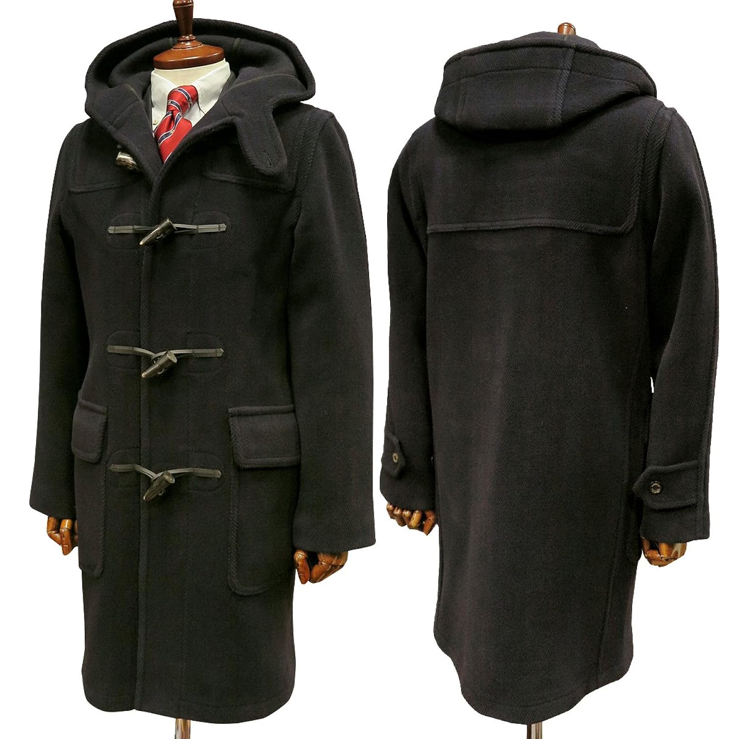 チンストラップや肩・ヨークの当て布、水牛のトッグルやレザーロープ、フラップポケットなど、伝統的なダッフルコートのディテールはそのまま。膝上丈のスリムフィットなシルエットが、よりモダンなイメージを演出しているダッフルコートです。