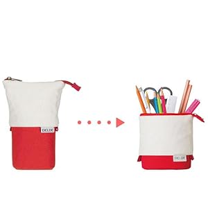 サンスターが販売している大容量が魅力のスタンド型ペンケースです。ファスナーを開けた後、両側にあるつまみを下げるだけでスタンド型に変身します。底に板が入っていて安定感は普通のペン立てと変わりません。先ほど紹介したスタンド型のネオクリッツとは異なり、ファスナーは側面ではなく、上側(立てた時)についています。そのため底の方の消しゴムや付箋などの小物が取りにくく、内側のポケットにいれることになります。ペンが35本も入るという圧倒的な収容力が最大の魅力です。デザインも通常のツートーンの他に、縦じま、横じま、明るめの色、落ち着いた色と様々あるので使う場面に適したデザインを選べます。