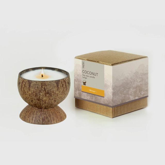 南国らしいココナッツの殻の中に、ソイ・ワックスのろうそくを入れたもの。マンゴ、パッションフルーツ、マンドリンオレンジ、ココナッツなど、トロピカルなアロマが部屋に広がります。各690THB(タイバーツ)。