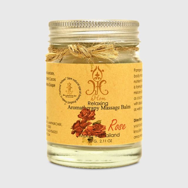 肌に優しいオーガニックオイルに、心身ともにリラックスできるローズのエッセンシャルオイルで香りをつけたマッサージバーム。350THB(タイバーツ)。