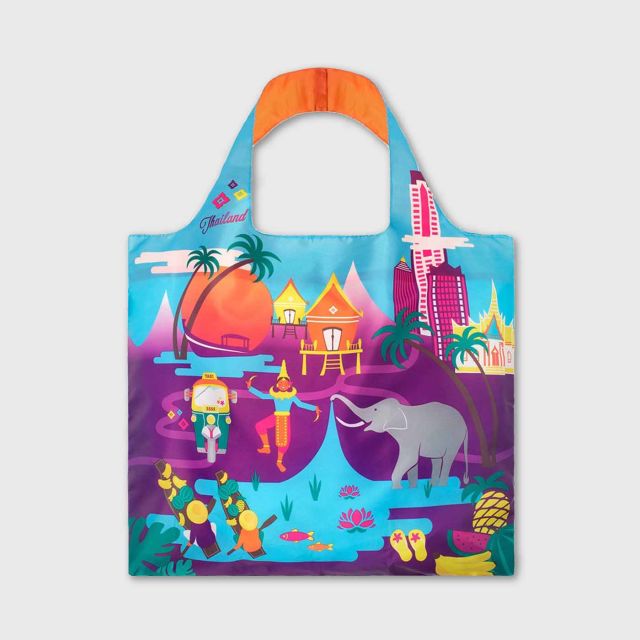 バンコクの高層ビル群、寺院、象、水田など、タイらしい絵柄が鮮やかなカラーで描かれたエコバック。嵩張らないので、ばらまき用のお土産にもぴったりです。2200THB(タイバーツ)。