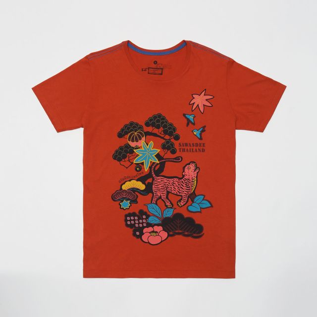 タイらしい色使いとモダンなタッチで描かれたタイランドのTシャツ。普段のカジュアル着に違和感なく合わせられるデザインで、実用的なお土産です。650THB(タイバーツ)。