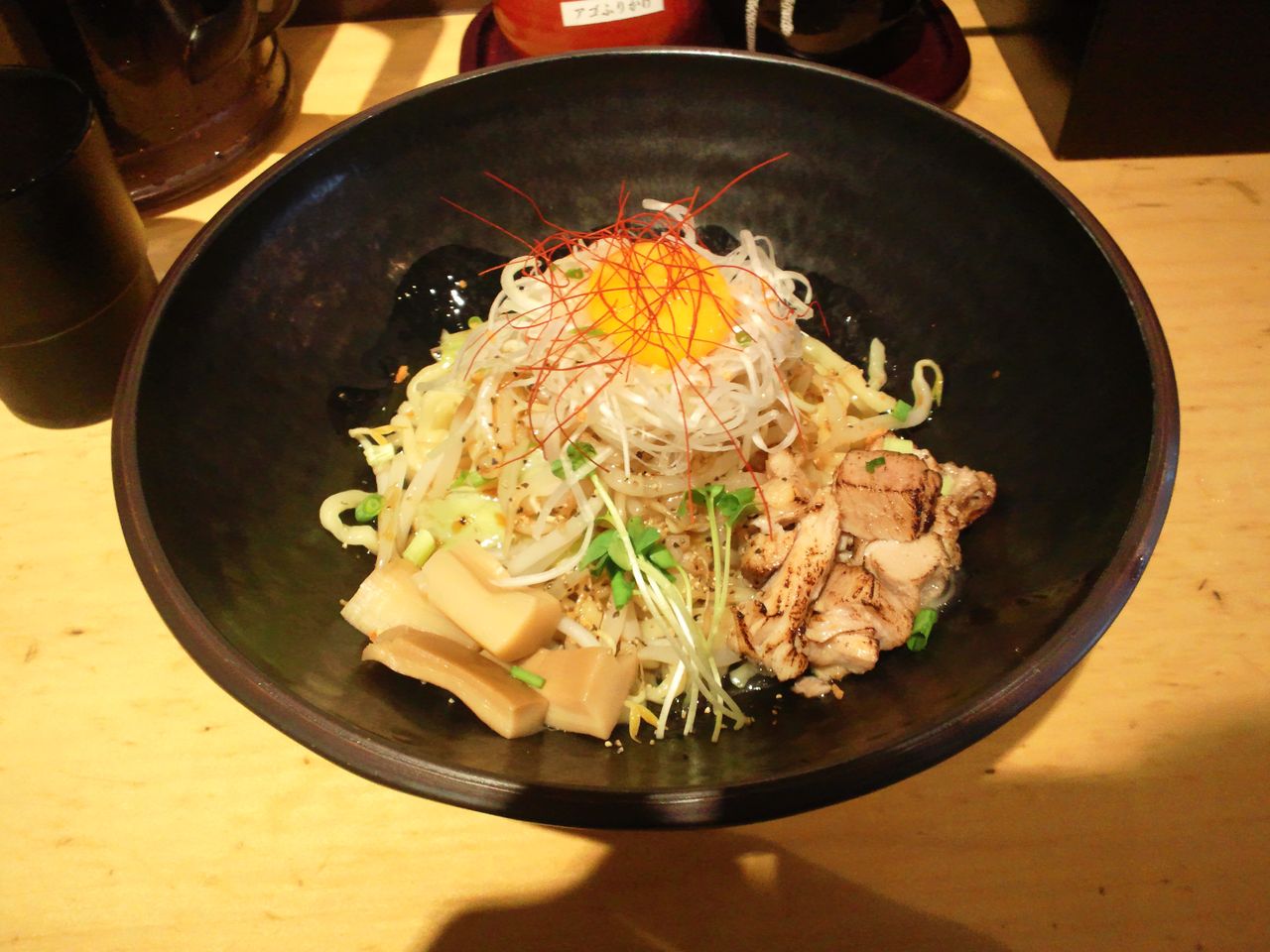 「かぐら」は立川では唯一のまぜそば専門店で、上品であっさりとした味わいのまぜそばを特徴としています。醤油ダレが絡んだ極太のちじれ麺の上に、メンマ、角切りチャーシュー、ネギ、三つ葉、そして卵黄がきれいに盛り付けられており、洗練された味わいを楽しめます。