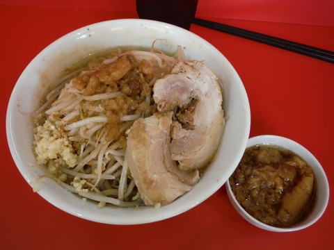 ラーメンは並盛で300g、価格は750円。麺が他の二郎インスパイアに比べて美味しく、やや乳化した豚骨の旨みの感じるスープとよく合います。特筆すべきはチャーシュー。脂身と赤身が両方とも柔らかく仕上がっていて絶品。トッピングと麺、そしてスープのバランスがよく総じて完成度の高い1杯です。