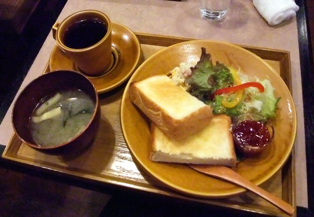 胡町駅から徒歩3分。たくさんのメニューが用意されている街の喫茶店です。気軽にふらりと立ち寄れるカジュアルな佇まいで、地元の方が朝早くから利用されているようです。パスタやピラフ、カレー、ホットケーキ、ハンバーグなど挙げればキリがないほどの品揃え。そんな豊富なメニューも魅力的ですが、朝ごはんなら540円の「モーニング」をいただきましょう。バタートーストにポテトサラダ、野菜サラダ、ハム、ゆで卵にお味噌汁、コーヒーと理想の組み合わせがワンプレートに。味付けも程よく、毎日食べても飽きのこない味わいです。