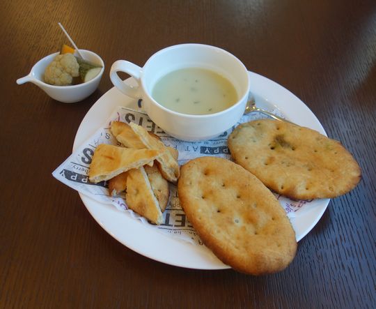 9:00までのモーニングには、焼きたての「妖精のパン」が2枚にポタージュ、アメリカンコーヒー、ビスコッティで500円。こちらのパンは催事などでも美味しいと評判なんですよ。