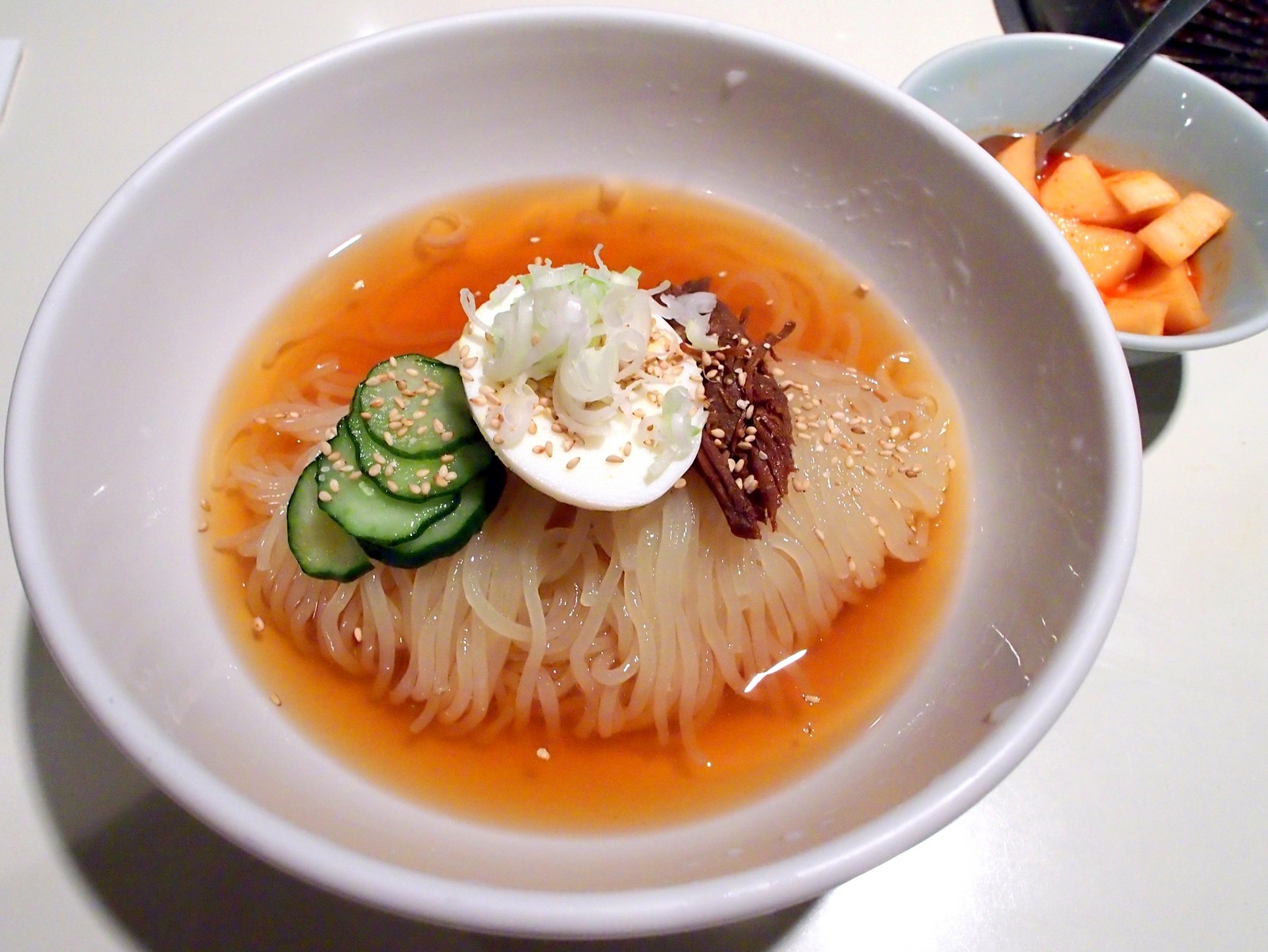 盛岡駅より徒歩15分のところにある焼き肉屋さんです。盛岡冷麺発祥のお店として知られています。冷麺(850円)は辛さを選ぶことができ、別辛を選べば、カクテキが別の小皿に盛られて提供されます。スープは甘味のある優しい味わいで麺の食感や旨さを存分に堪能できます。