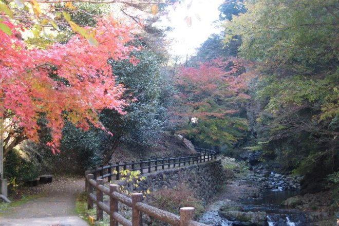 目的地は国道438号沿いにある「美霞洞渓谷」で、讃岐10景にも選ばれる景勝地です。「美霞洞渓谷」は土器川にかかる風光明媚な渓谷で「三霞洞八景」と呼ばれる名所が点在。桜から紅葉まで四季折々に姿を変える自然と、渓谷の美しさが調和し見事な景観を描き出します。