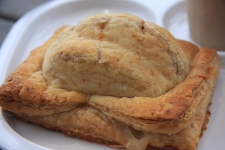 サクッとした香ばしいシェフこだわりのパイ生地に、シナモン入りのりんごがたっぷり詰まっています。りんごはサイコロ状にカットされいますのでシャキシャキとした歯触りが絶妙です。厚めに焼き上げられたバター風味のパイ生地の香ばしさと、りんぎの甘さが食べ応え十分です。