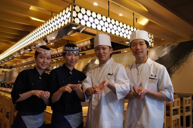 JR西船橋駅改札内にある立ち食い寿司店のつきじ千鮨。1貫80円~というリーズナブルな価格でカジュアルに職人の握りたてのお寿司を楽しめます。天井が高く明るい雰囲気の店内は女性も多くにぎやかで、スタイリッシュで清潔感もあります。