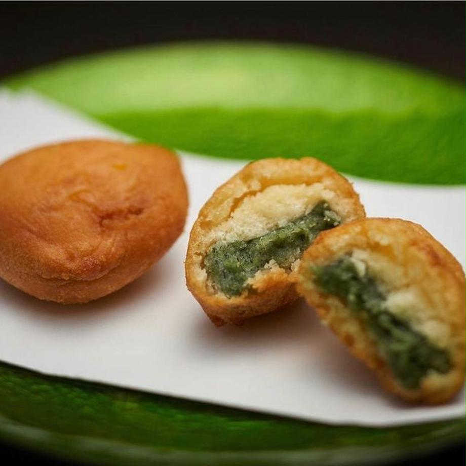 福島の郷土料理「凍みもち」を、生地で包んで揚げたのが「凍天(しみてん)」です。「もち処木乃幡」のオリジナル商品です。1961年から「凍みもち」を製造・販売していた「コワタ食品」が開発し、1996年から自社店舗「もち処木乃幡」をオープンして販売を始めました。まわりの生地はドーナツのような生地でカリッとしてほんのり甘く、中にはモチモチのヨモギの凍みもちが入っています。メディアでも何度も取り上げられ、福島を代表するおみやげとして多くの支持を得ています。