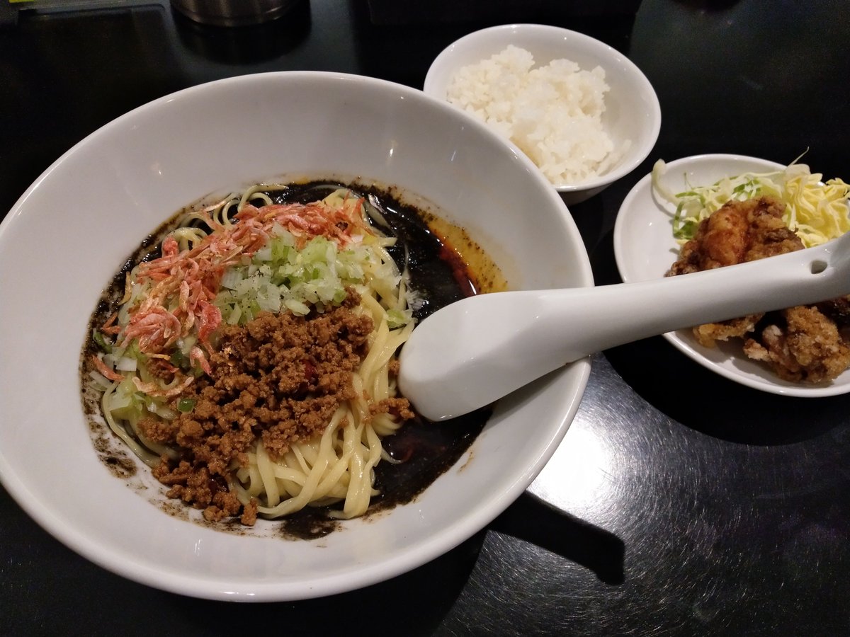 女性に一番人気という「汁なし担々麺(黒)」は680円。黒の秘密は黒ごまとイカスミなんです。まずは30回ほどよくタレを麺に絡ませます。そうすることで、丼全体に奥深いタレの味が広がっていきますよ。イカ墨とゴマのコクに、さくら海老の香りと旨味が絶妙。辛さは選べますが、他店に比べて辛過ぎることがないので、辛いもの好きの人は少し強めでお願いしてもいいかもしれませんね。