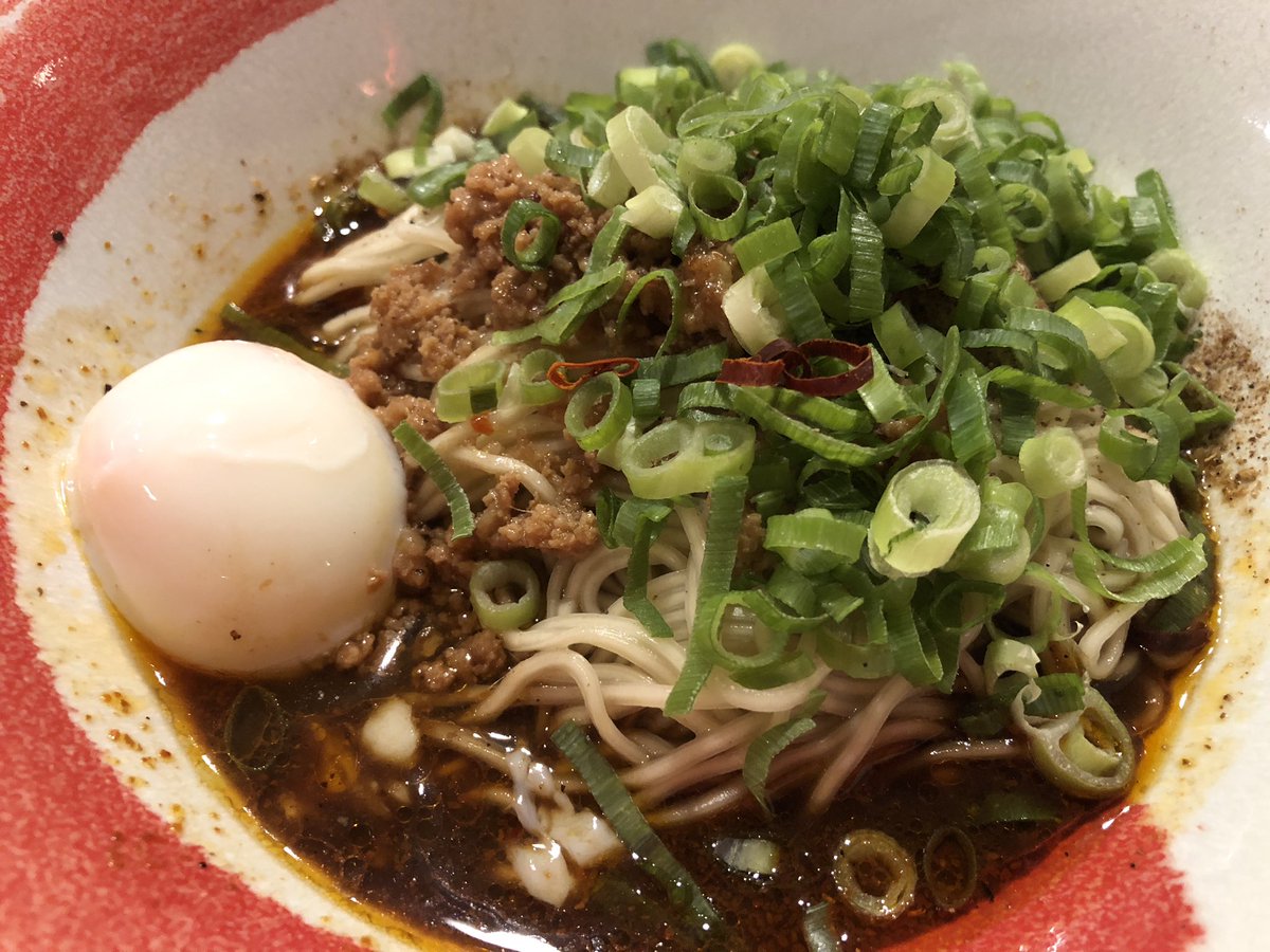 清潔な店内でいただける「汁なし担々麺」は600円。さらに辛さを楽しみたい方には「汁なし担々麺昇天」がおすすめです。700円とお値段は少し上がりますが、その分辛みも強くなっています。たっぷりの青ネギで覆われたそのビジュアルもさることながら、麺の下に敷かれている大量の唐辛子に目を見張ります。辛いだけではなくピリピリと痺れる山椒の風味も加わって、まさに「昇天」しそうな刺激です。ちょっと味をマイルドにしたい時には温玉トッピングがおすすめです。