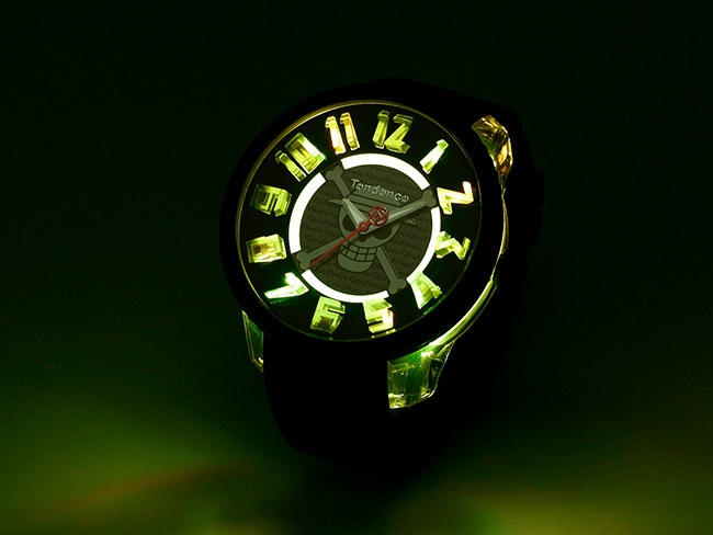 テンデンスでも人気の光る時計「FLASH」がベースで、時計全体に「麦わらの一味」のこれまでの旅を表現するようなメッセージが隠れています。