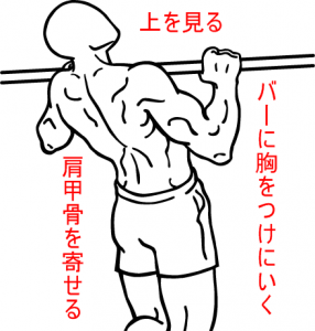 このため、「バーに胸をつける」意識で行い、しっかりと肩甲骨を寄せるようにするのがポイントです。