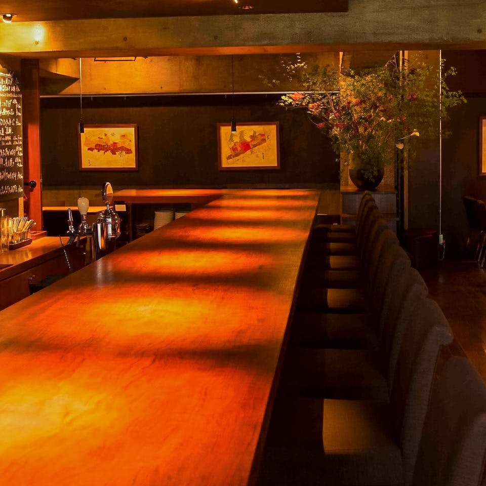 大きな一枚板のカウンター席が中心となっているバーで、おしゃれながらもカジュアルな雰囲気で楽しむことができるのが魅力です。