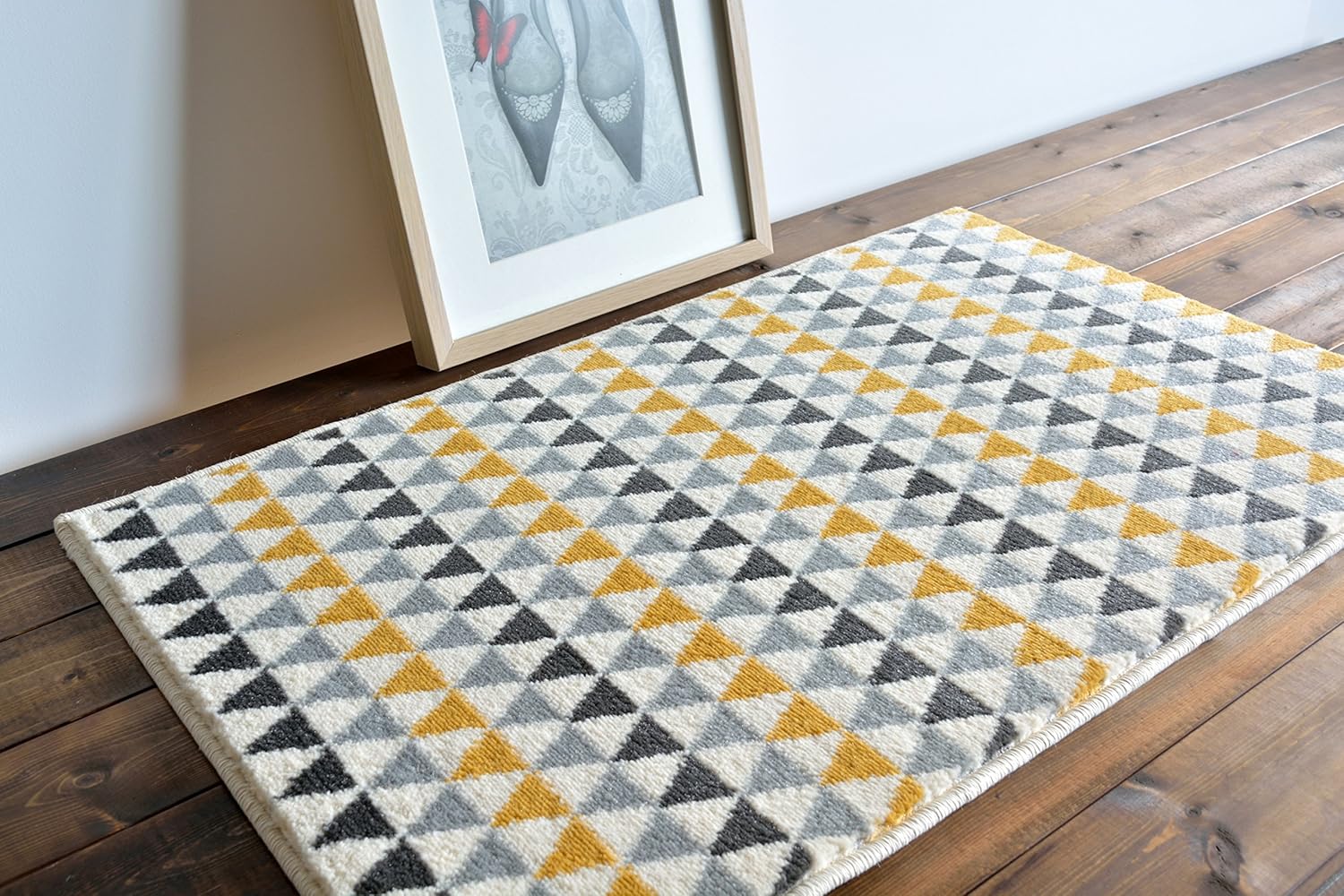 三角形が連続して並び、大小の三角形が浮かび上がるジオメトリックなデザイン。エジプト製のウィルトン織りで、ソフトなタッチです。色も辛子色、グレー、ブラックと落ち着いた色合いながら、玄関をおしゃれに演出してくれます。